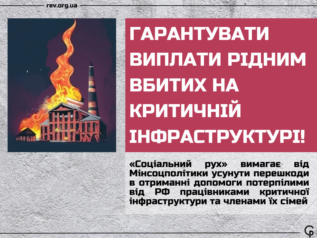 Напередодні ухвалення постанови наша ГО звернулася до Мінсоцполітики, виклавши шляхи розв’язання проблем з метою забезпечення справедливості і передбачуваності при розгляді заяв за Законом № 2980. Зокрема, «Соціальний рух» вимагає: – забезпечити щомісячну публікацію зведеної статистики органів ПФУ щодо застосування Закону № 2980 та належно інформувати про право на відповідну допомогу; – створити робочу групу для напрацювання змін до Порядку № 1396 та Закону № 2980, які уможливлять призначення і виплату одноразової допомоги усім працівникам секторів критичної інфраструктури, визначених Переліком секторів № 1109 тощо.