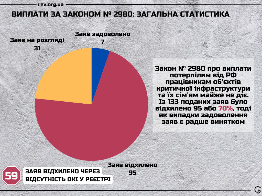 Зібрані нашою ГО протягом серпня-жовтня 2024 р. дані свідчать, що до органів ПФУ було подано 133 заяви про призначення і виплату допомоги, з яких 95 відхилено (70%). Задоволених заяв нараховується лише 7 або 5% від загальної кількості. Наразі 9 відмов оскаржуються в судах. Серед підстав відхилення заяв переважає (62%) відсутність підприємств у Реєстрі об’єктів критичної інфраструктури (59 із 95 відмов викликані цією підставою). Згідно з отриманими від органів ПФУ даними, у 7-ми регіонах всі відмови викликані невключенням підприємств до Реєстру.