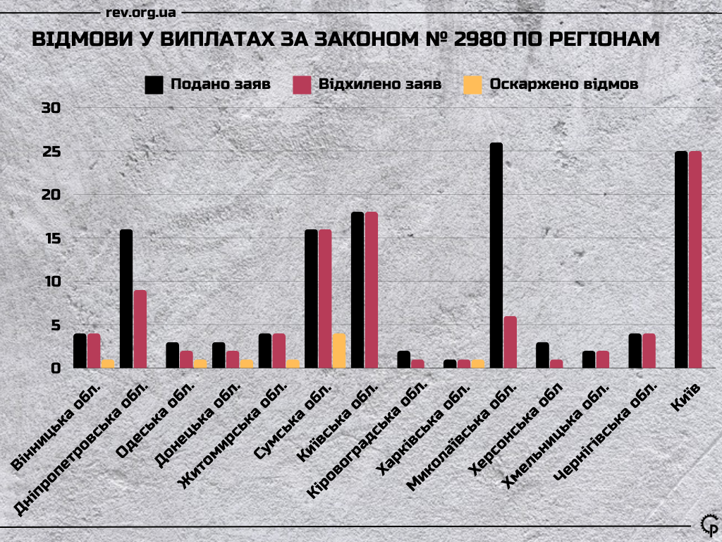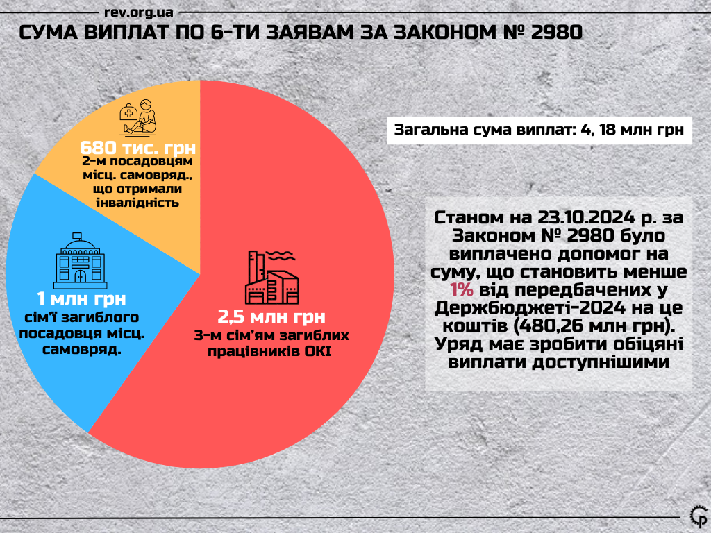«При цьому за 32 місяці вторгнення від рук російських загарбників на роботі загинули сотні людей і ще більше скалічено, з яких левова частка відноситься до категорій осіб, вказаних у ст. 1 Закону № 2980», – зазначається у зверненні ГО. Таким чином, кількість отримувачів виплат є мізерною на тлі загальної чисельності людей, які могли її отримати