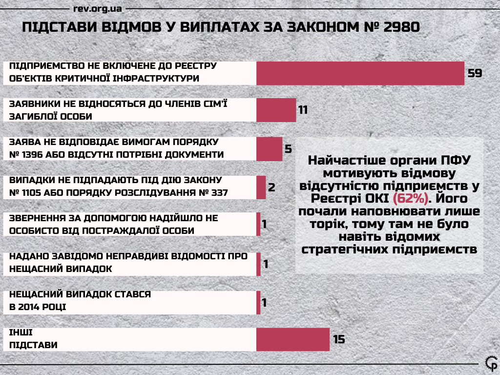UPD: Вже після направлення Звернення до Мінсоцполітики нами було отримано відповідь Головного управління ПФУ в Харківській області від 25.10.2024 р. на запит, згідно з якою орган відхилив 11 із 13 заяв про призначення і виплату допомоги. Причиною є саме непідтвердження статусу ОКІ в підприємств, де сталися нещасні випадки. Це означає, що всього по Україні було відхилено щонайменше 105 заяв із 145-ти. При цьому 65 із 105 відмов продиктовано саме відсутністю підприємства в Реєстрі.