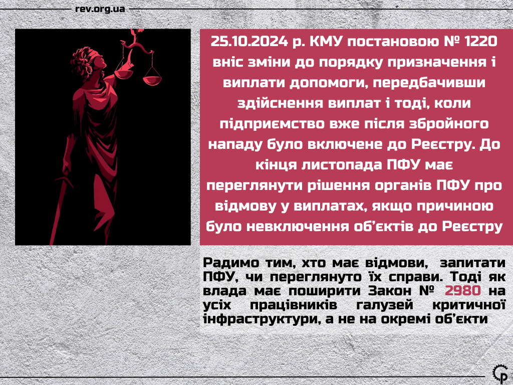 UPD-3: Сумський окружний адмінсуд рішенням від 28.10.2024 р. у справі № 480/5947/24 задовольнив позов електромонтера філії «Охтирський район електричних мереж» АТ «Сумиобленерго» до ГУ ПФУ в Сумській обл. про визнання протиправним і скасування рішення про відмову у призначенні та виплаті грошової допомоги за Законом № 2980. Трагедія сталася 07.04.2022 р., коли Реєстр ще не вівся, тому орган ПФУ наполягав на відсутності в підприємства статусу ОКІ. Як постановив суд, віднести підприємство до ОКІ можна було на підставі того, що електроенергетика входить до Переліку секторів критичної інфраструктури, затв. постановою КМУ від 09.10.2020 р. № 1109.